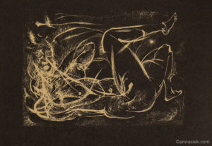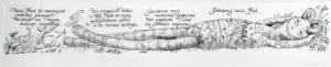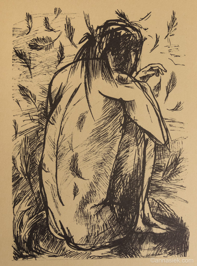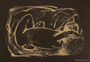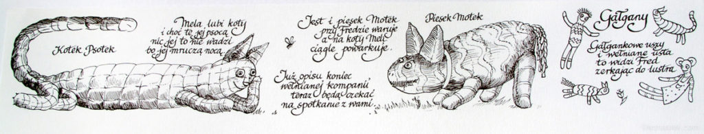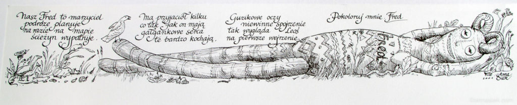 Moje ilustracje wykonuję najczęściej piórkiem, czarnym lub białym tuszem, ale również akwarelą i kredką. Obrazy te nierozerwalnie połączone są z tekstem, bywa też, że same stają się rodzajem kontynuacji rozpoczętej historii lub jej dopełnieniem.