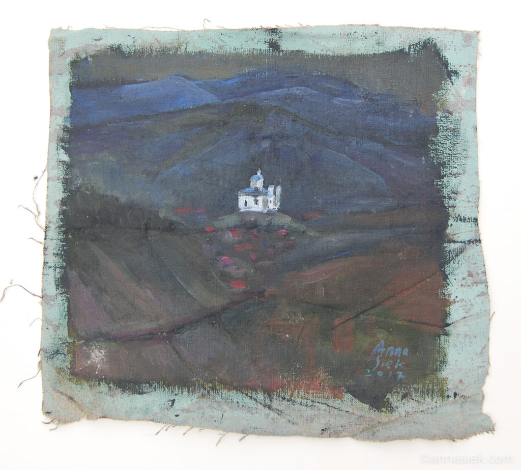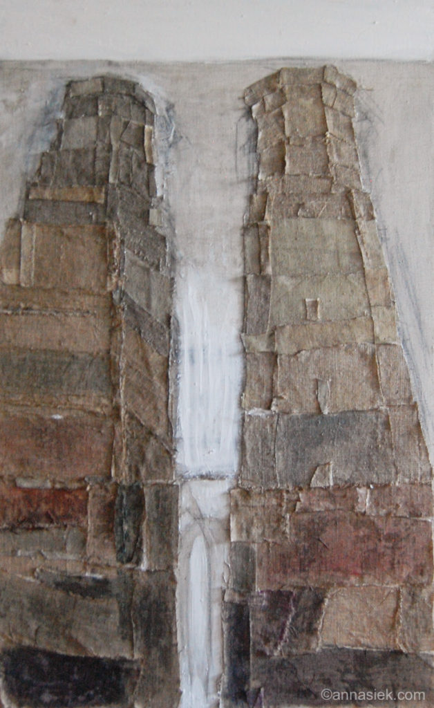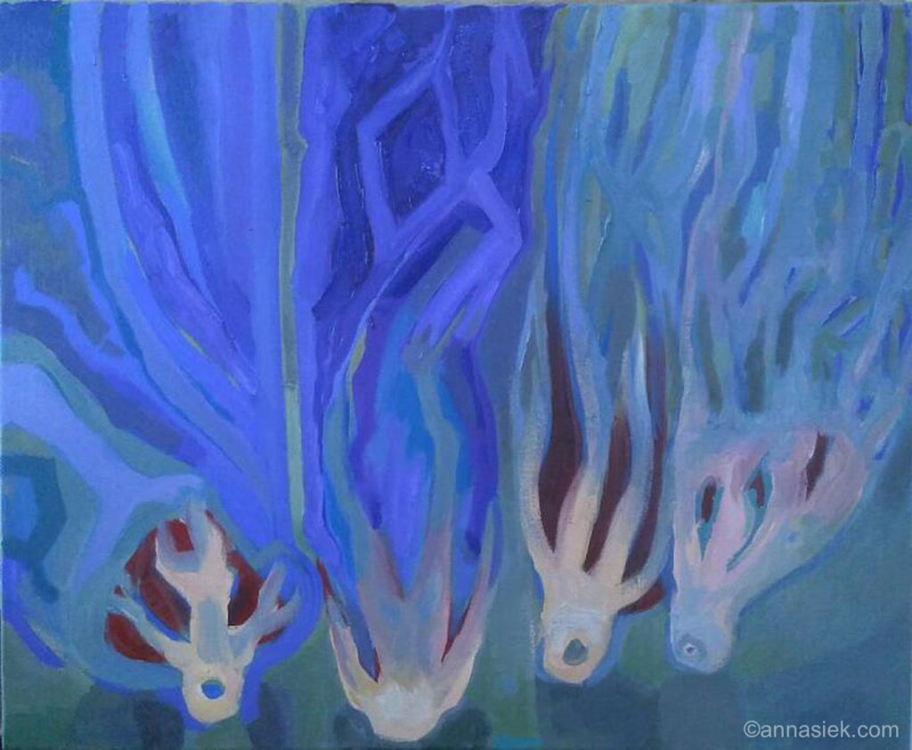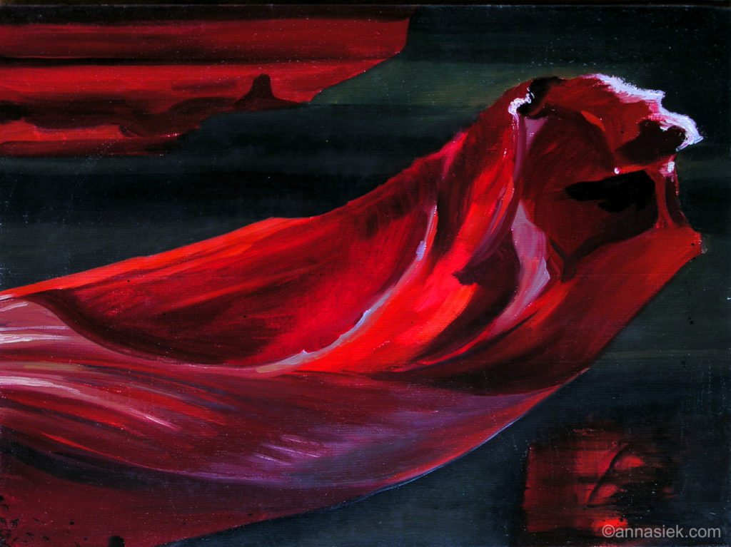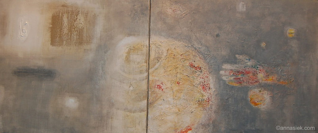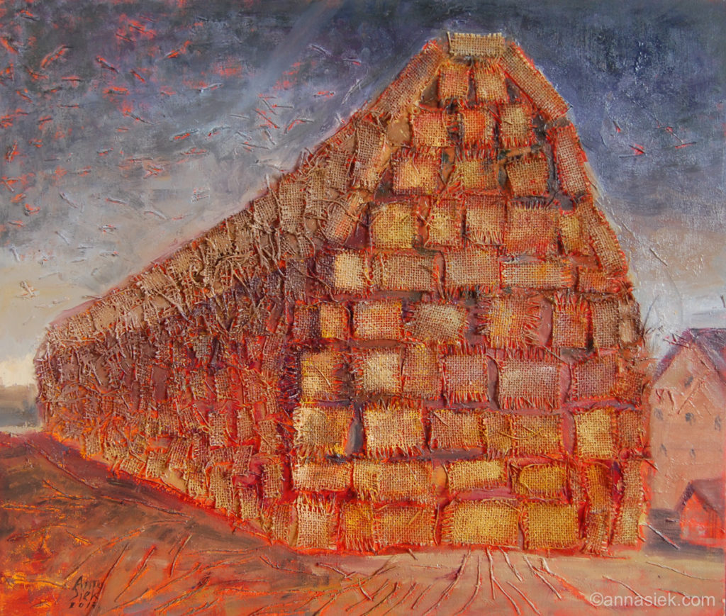 Malarstwo olejne podobnie jak i grafika czy rzeźba inspirowane są otaczającym mnie światem, bieżącymi wydarzeniami i moim światem wewnętrznym. Jest działaniem bardziej bezpośrednim niż grafika, związanym z chwilą, w której obraz powstaje. Daje mi większą swobodę i możliwość spojrzenia z innej strony na aspekt koloru i struktury obrazu. Jego powierzchnia jest dla mnie często polem do eksperymentu. Bywa, że płótno pozostawiam niezamalowane lub zasłonięte kolejnymi warstwami innego materiału.