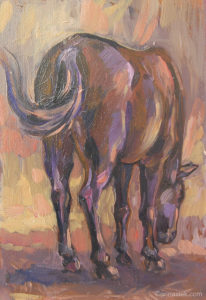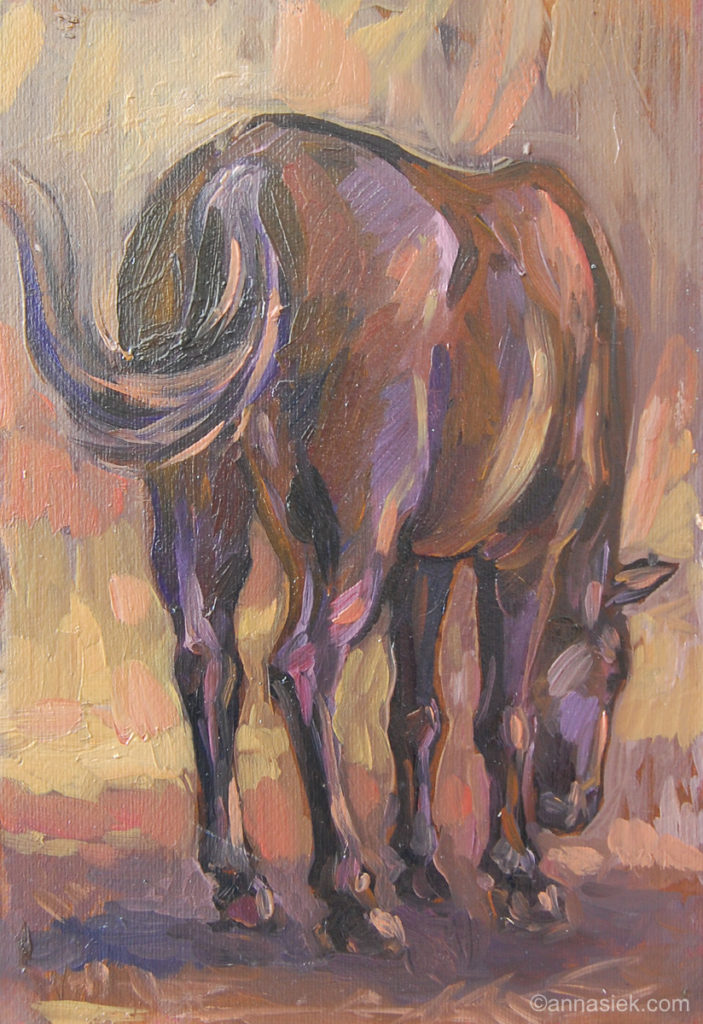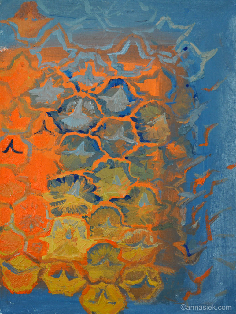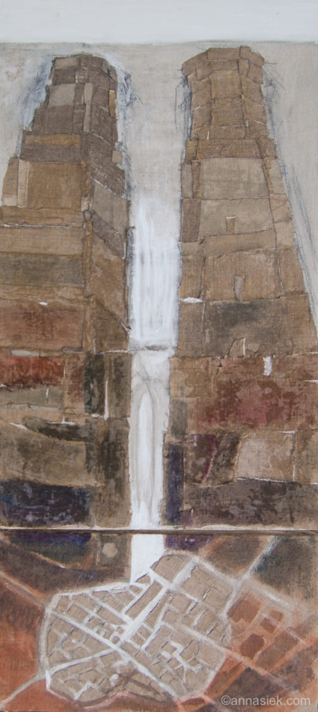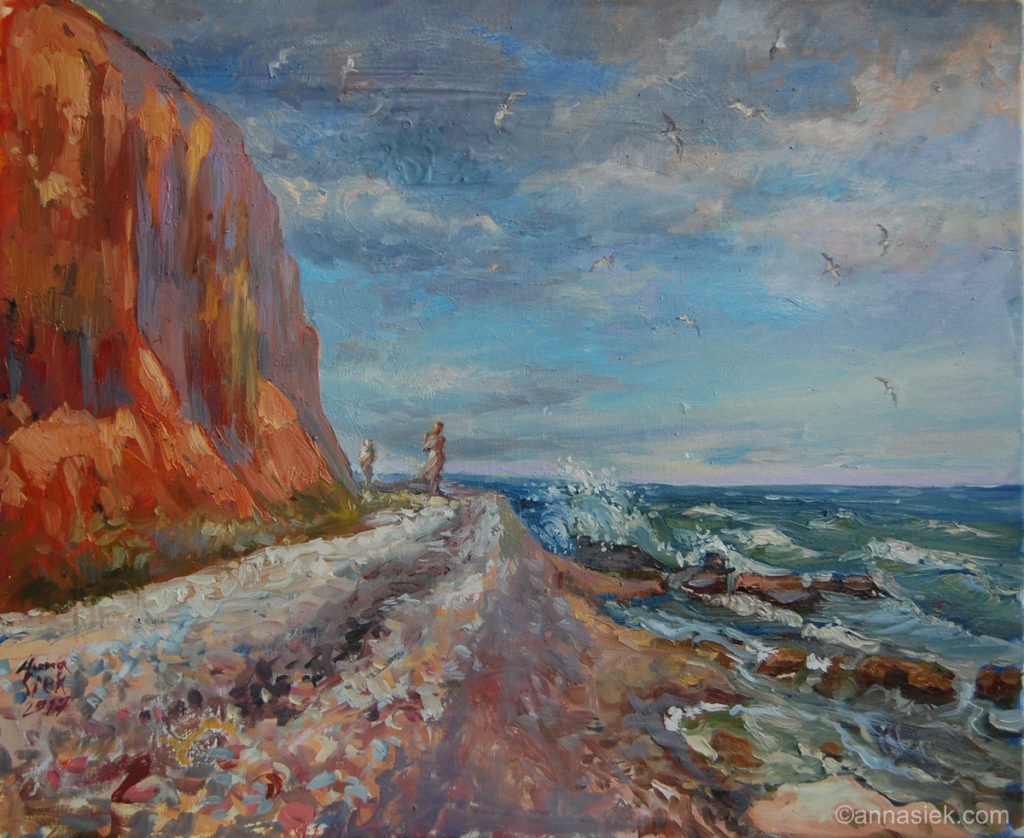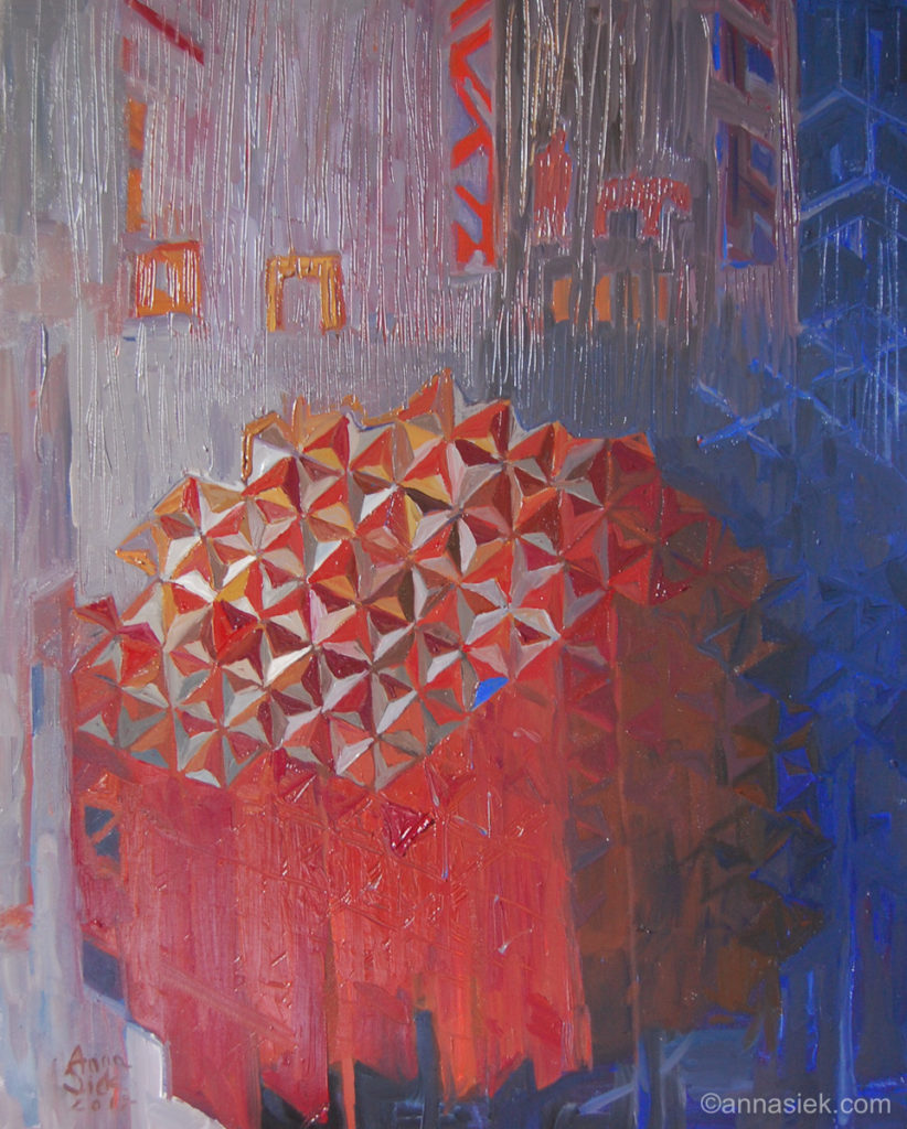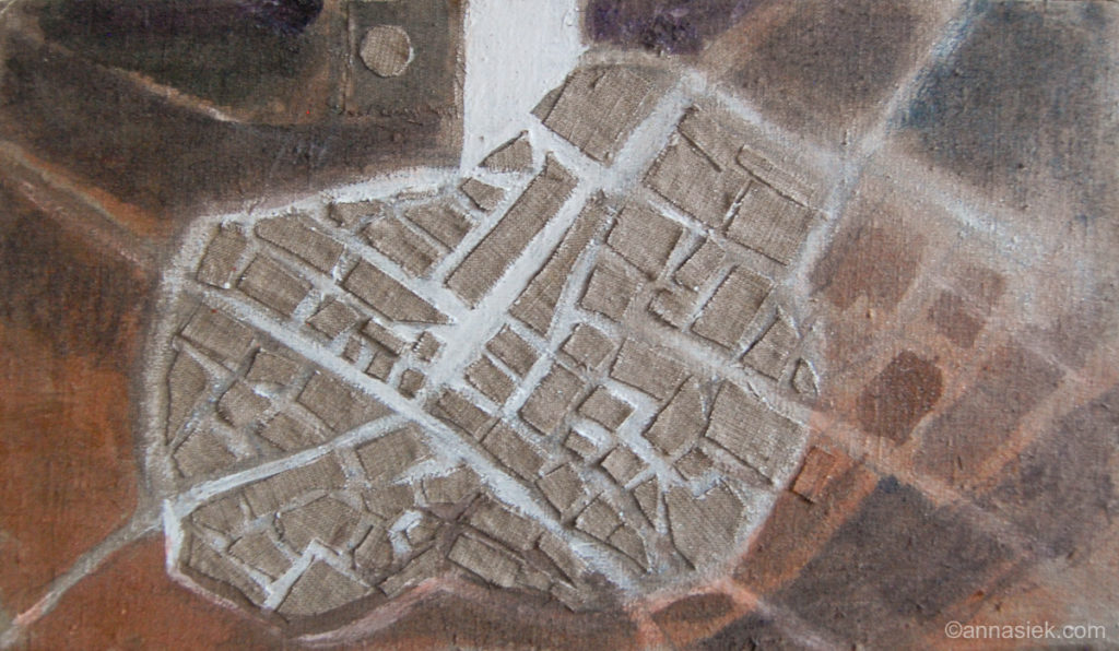 Malarstwo olejne podobnie jak i grafika czy rzeźba inspirowane są otaczającym mnie światem, bieżącymi wydarzeniami i moim światem wewnętrznym. Jest działaniem bardziej bezpośrednim niż grafika, związanym z chwilą, w której obraz powstaje. Daje mi większą swobodę i możliwość spojrzenia z innej strony na aspekt koloru i struktury obrazu. Jego powierzchnia jest dla mnie często polem do eksperymentu. Bywa, że płótno pozostawiam niezamalowane lub zasłonięte kolejnymi warstwami innego materiału.
